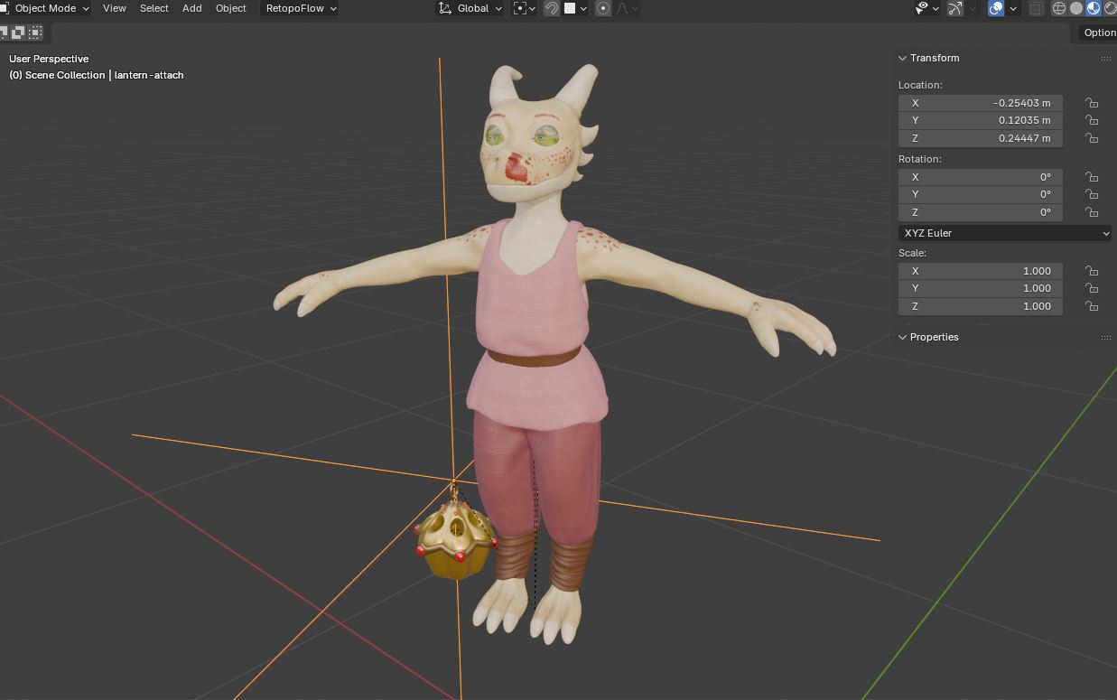 His high poly sculpt, as well as the final version of the lantern he carries. For his animation ready model, I made a version with fewer vertices and cleaner geometry then used blender’s normal bake feature in the rendering options to bake a normal map of his sculpt on to the material of the final model. This was later combined with a procedurally generated scaly skin material to create his final normal map. The scaly skin was also used as a diffusion and a roughness texture in his initial material. I simplified it later by baking the roughness, diffusion, and normals from the initial material into three separate 4k textures.