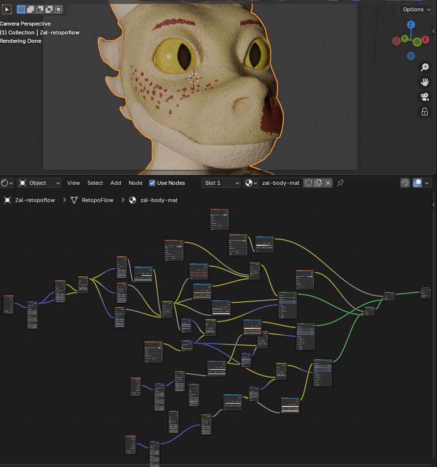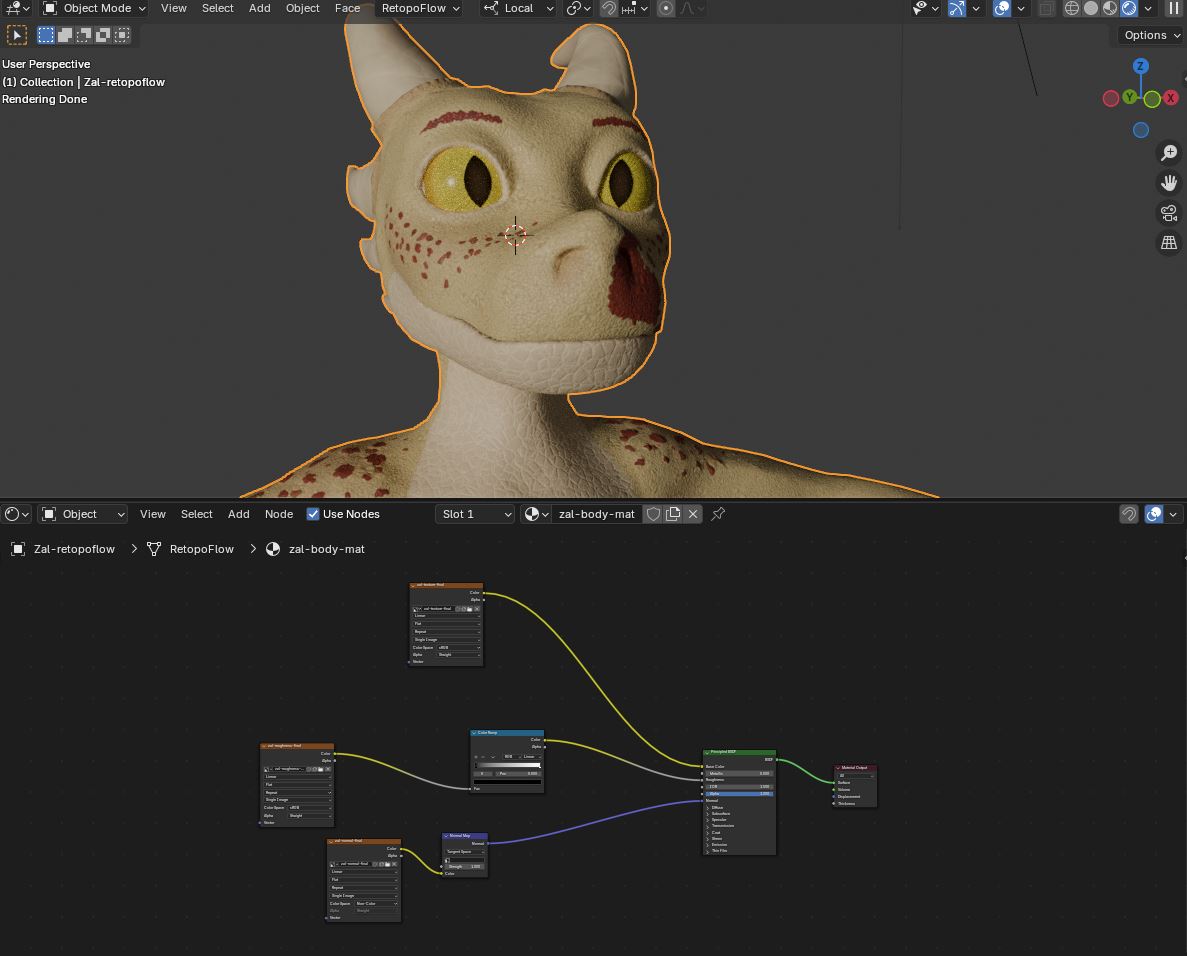 Zal’s rig was made using Blender’s Rigify add-on, with heavy adjustments to the face of the humanoid meta rig because of proportional differences.